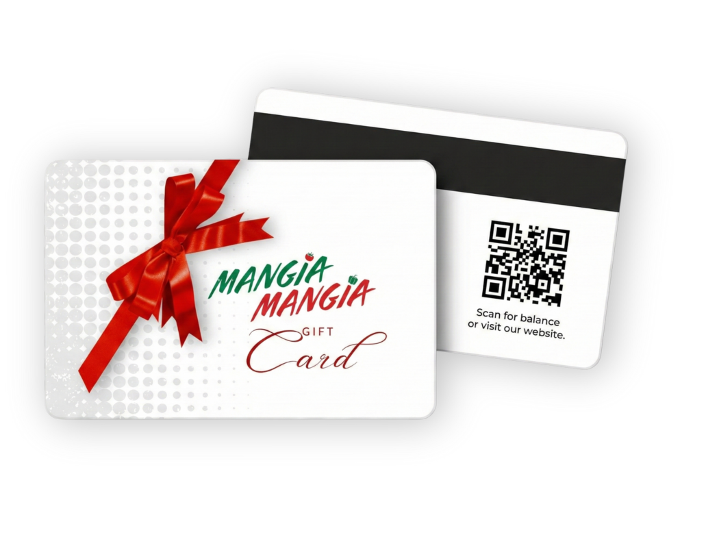 Mangia Mangia gift cards can be loaded for variable amounts from $25.00 to $500.00.